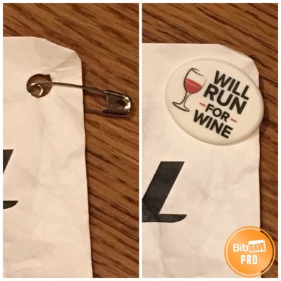 BibBoards have a flat surface on the exposed side for company logos or other content (such as my chosen “Will run for wine” slogan). A second piece works by pushing part of a racer’s shirt into a recess, providing a secure fit. When the race is over, they simply pop off. BibBoards can be reused, and their special shape holds down a bib MORE secure than dangerous safety pins, without the fuss or holes.