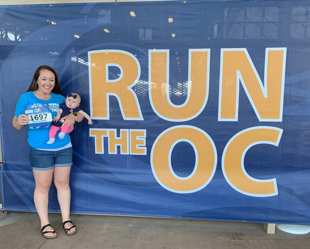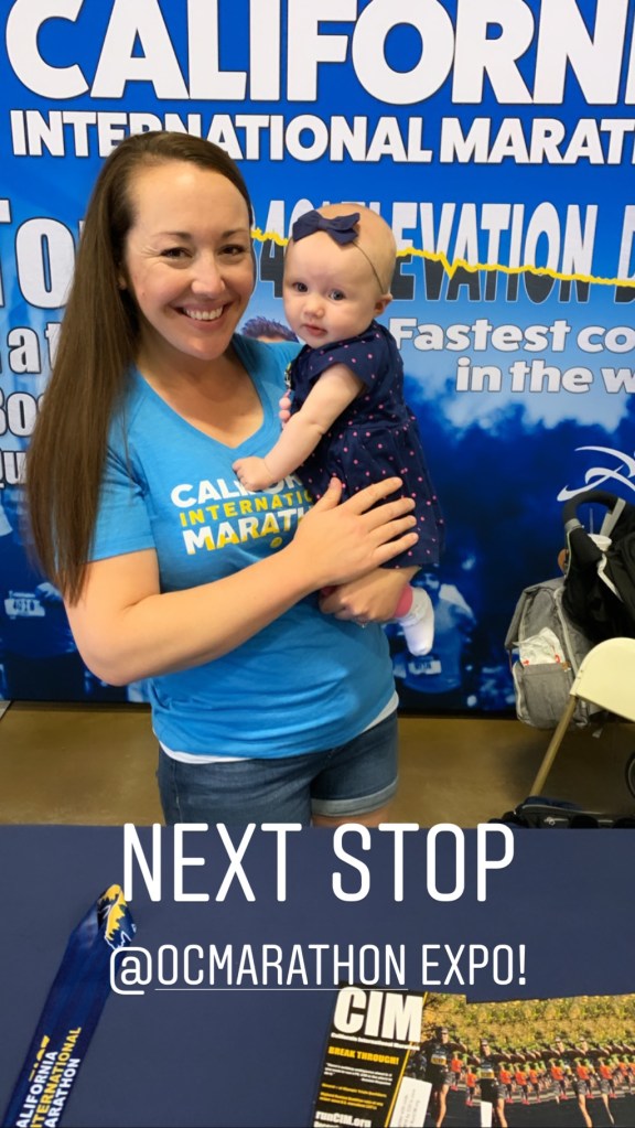 After grabbing a quick lunch and dropping hubby dearest off at the hotel, my mom, baby, and I made our way to the OC Marathon expo. This year, I have the privilege of being a California International Marathon ambassador for the third year in a row. As an ambassador, I volunteered to man the CIM booth at the expo for a couple of hours while the main guy took a lunch break. It’s such a pleasure to talk about CIM, promote my discount code (RUNSTRONG10 to save $10), and hear so many share their love of CIM!